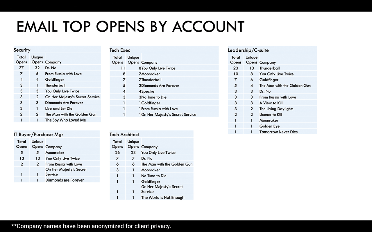 A table titled "Email Top Opens by Account" lists categories: Security, Tech Exec, Leadership/C-suite, IT Buyer/Purchase Mgr, and Tech Architect. Each category shows total and unique opens for various James Bond movie-themed email campaigns.