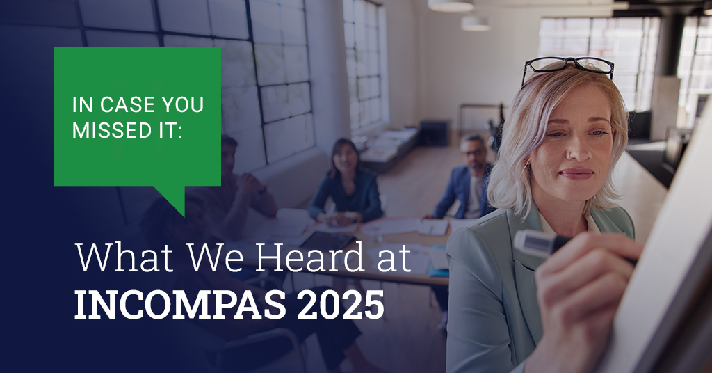 A businesswoman writes on a whiteboard during a meeting with three colleagues in a modern office. Text overlay reads: “IN CASE YOU MISSED IT: What We Heard at INCOMPAS 2025"