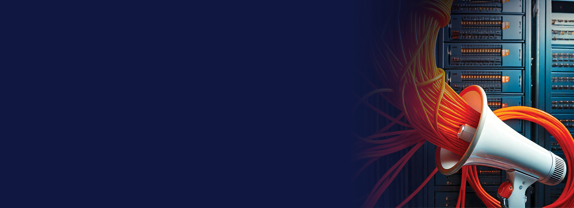 A megaphone surrounded by colorful network cables is positioned in front of server racks, with a dark blue background on the left side of the image.