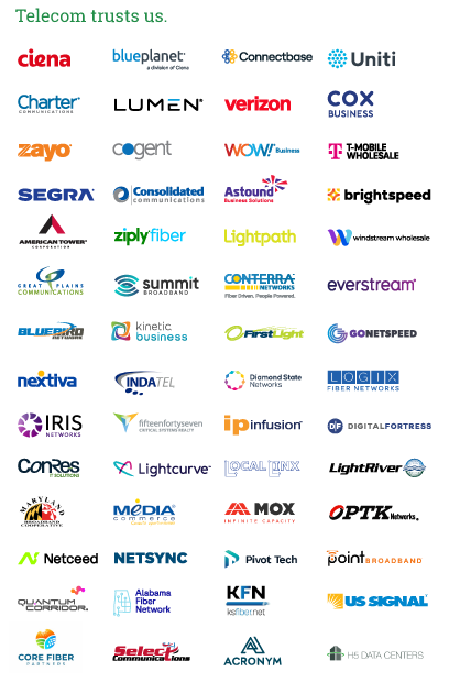 A grid of 45 telecom company logos, including Verizon, Charter, Cox Business, T-Mobile, Lumen, Astound, Brightspeed, Segra, Zayo, Uniti, Netceed, and others, under the heading “Telecom trusts us.”.
