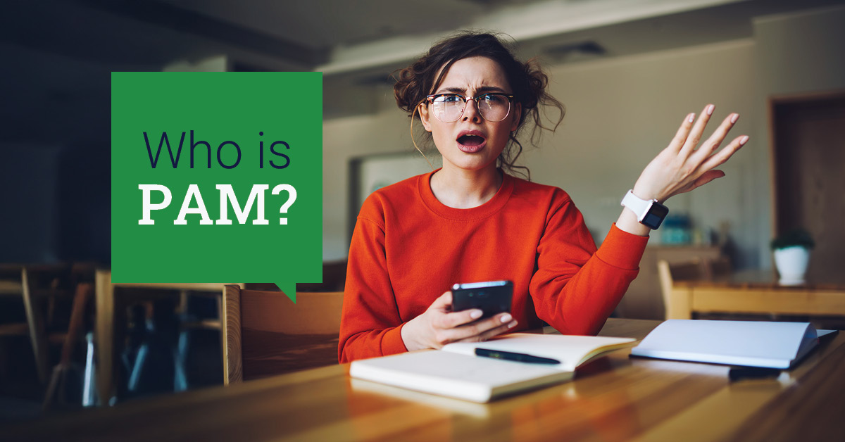 A confused woman in glasses and a red sweater sits at a table with a phone and notebook, raising her hand. A green text box beside her reads, “Who is PAM?”.
