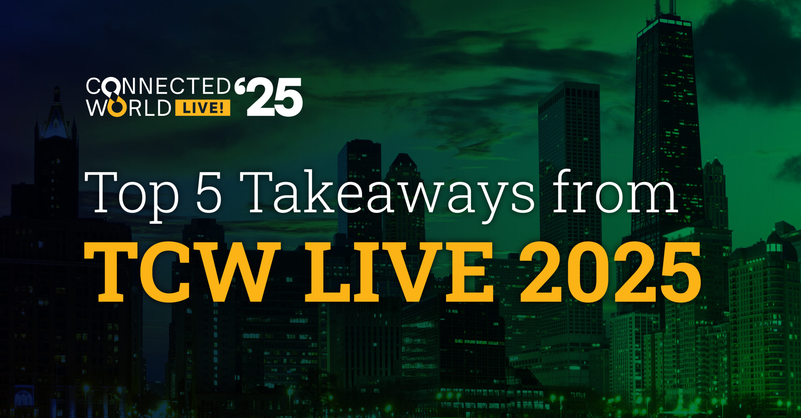 Dark city skyline background with the text “Top 5 Takeaways from TCW 2025 executive summary” and “Connected World LIVE! 25” in the upper left corner.