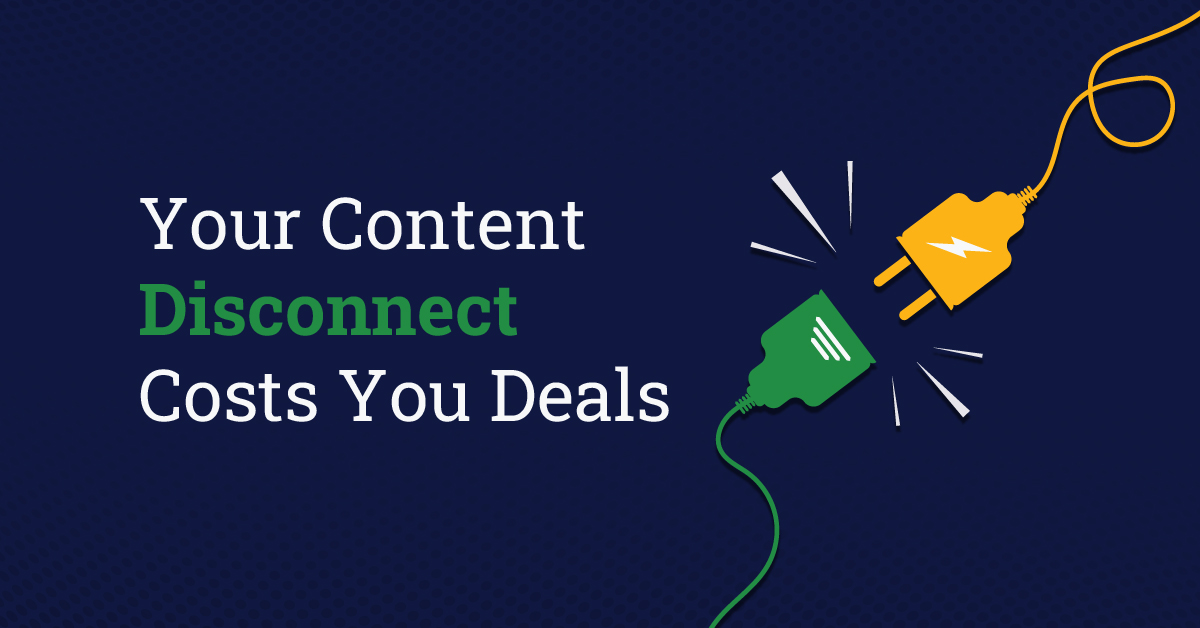 Dark blue background with white text: "Your Content Disconnect Costs You Deals." To the right, a green plug and yellow socket remain apart, lines showing disconnection—highlighting how content activation is costing you deals.
